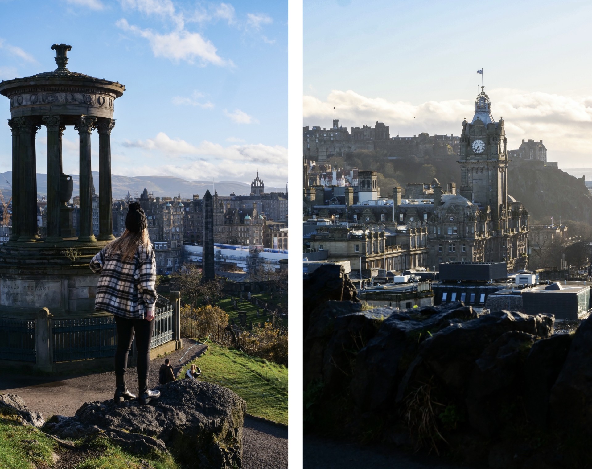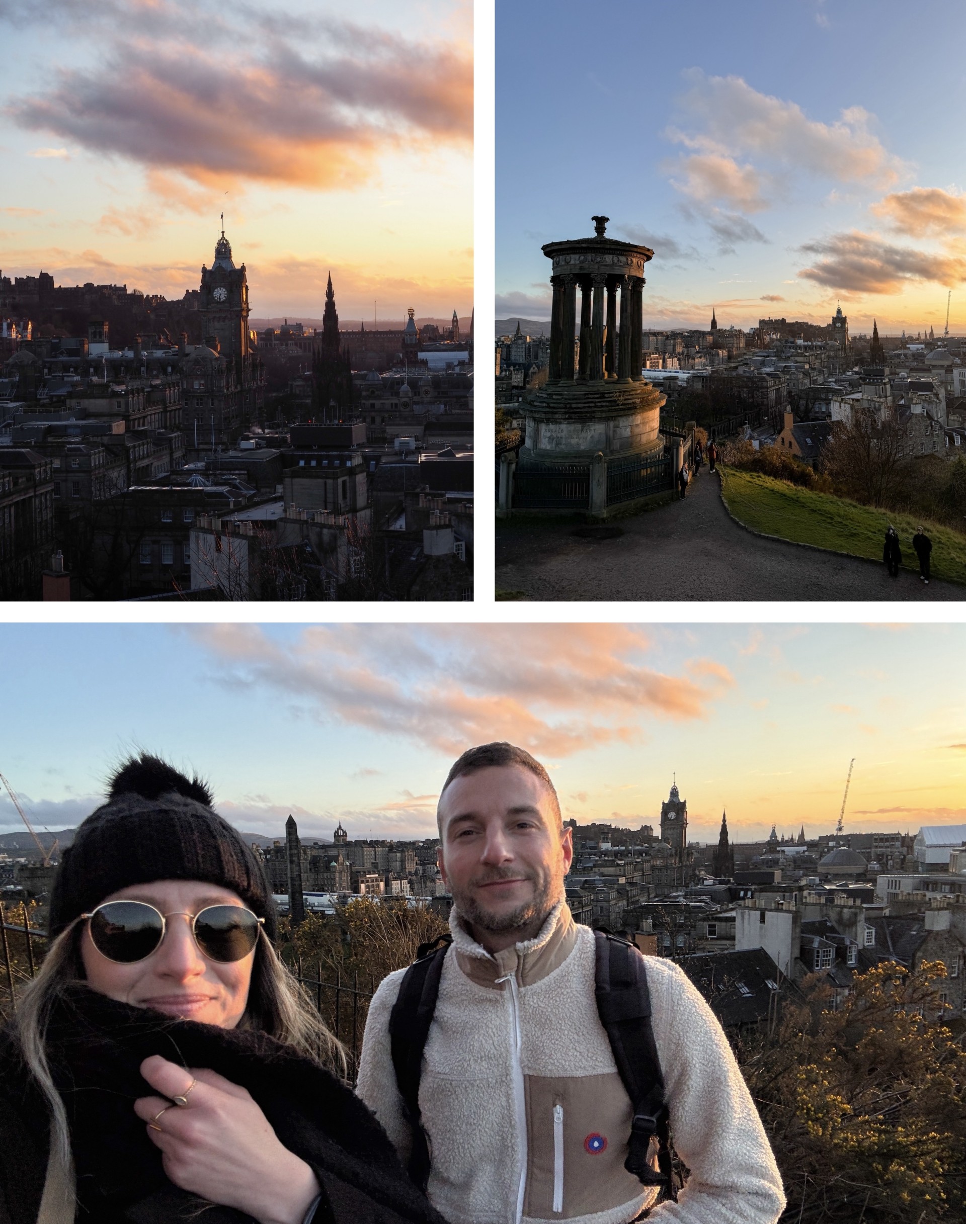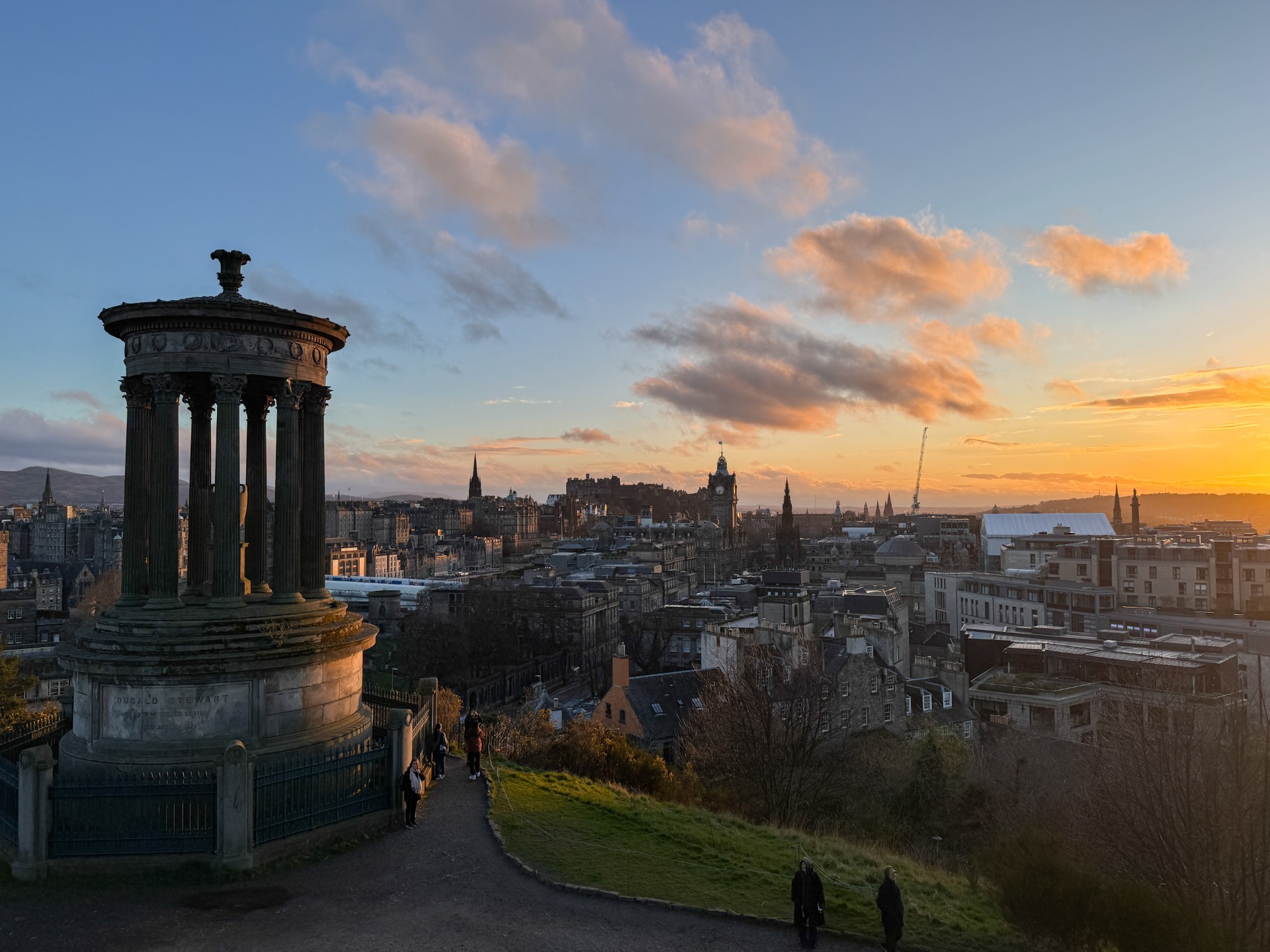 Calton Hill au coucher du soleil est un incontournable à Édimbourg. Il faut prévoir d’y arriver au moins une heure avant le coucher du soleil pour avoir une place sympathique. Depuis le sommet, on bénéficie d’une vue panoramique magique sur la ville.