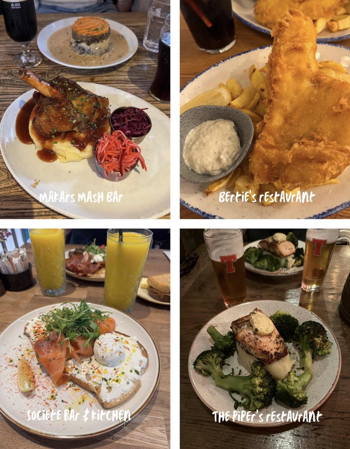 Pendant notre séjour, on a testé Makars Mash Bar : gros coup de cœur, je recommande à 100 %, c’était vraiment excellent ! On a aussi mangé un fish & chips chez Bertie’s Restaurant, c’était pas mal du tout. Pour le brunch, Society Bar & Kitchen était une super surprise, très bon et bien servi. Et on a dîné à The Piper’s Restaurant, ambiance écossaise garantie !