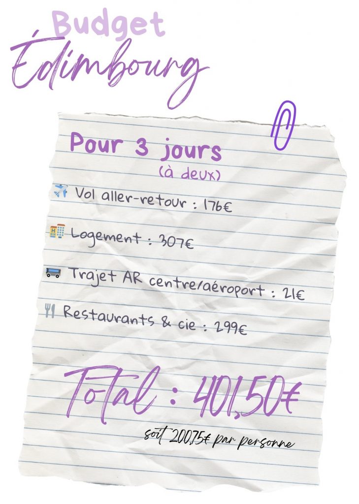 Bref, ce budget est là pour vous aider à vous faire une idée du coût d’un séjour à Édimbourg 🙂